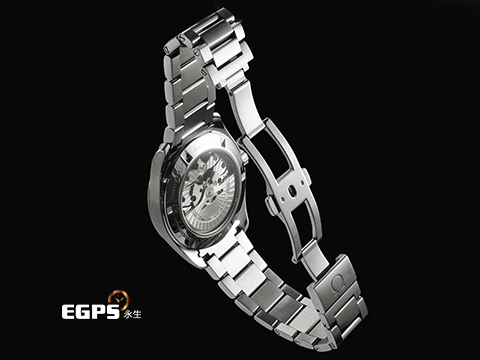 不鏽鋼材質錶殼、錶鍊帶及折疊帶扣 / 深灰色甲板紋面盤 / 夜光指針及時標 / 旋入式錶冠 / 藍寶石水晶玻璃鏡面及透明錶背 |