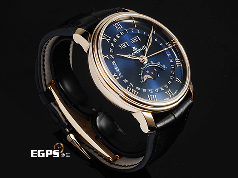 | BLANCPAIN 寶鉑 Villeret 系列 Quantieme Complet 全日曆月相腕錶 6654-3640-55B 藍色放射紋面盤 三日鍊 全日曆功能 月相盈虧 玫瑰金材質 2024年台灣公司貨 自動上鍊 40mm |