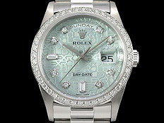 | ROLEX 勞力士 Day-Date 蠔式 星期日曆型 18346 原廠鑽圈、鑽石時標 冰藍色浮雕紀念面 PT950 鉑金材質 經典 DD36 元首型(President)錶帶 總統帶 勞力士服務中心保養完成 保固至2028年 附原廠保養卡 自動上鏈 36mm |