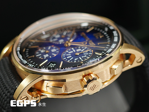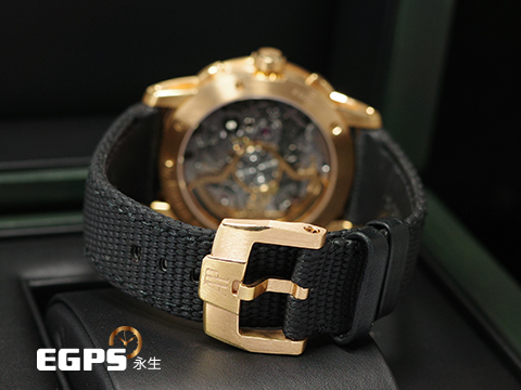 18K玫瑰金錶殼及帶扣 / 煙燻漸變藍色亮漆錶面 、玫瑰金色立體時標與指針 / 黑色複合材質錶帶 / 雙曲面藍寶石水晶玻璃鏡面及透明錶背 |