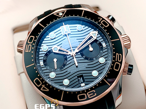 此44毫?米計時腕錶型號以不鏽鋼及18K Sedna?金製成?,配備設有Ceragold?瓷金潛水刻度?的拋光黑色陶瓷錶圈?。按鈕及錶盤同樣採用拋光黑色陶瓷製成?,錶盤飾以鐳射鐫刻波浪圖案?,6點鐘位置設有日期視窗?。