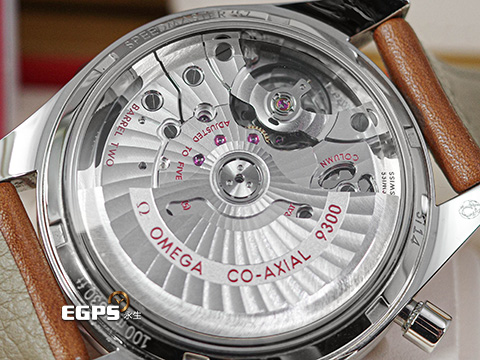 這款腕錶的靈感源自其傳奇的舊錶款,配備黑色錶盤,設有米色轉印顯示。9點鐘位置設有小秒針副錶盤,3點鐘位置的副錶盤則設有12小時計時盤及60分鐘計時盤。嵌入式時標部份覆有Super-LumiNova超螢光塗料,綻放綠色亮光。此型號的拋光刻面鍍銠中央時針和分針均採用「闊箭」款式,並覆上Super-LumiNova超螢光塗料。 41.5毫米不鏽鋼錶殼搭配棕色皮錶帶。這款時計搭載歐米茄9300同軸擒縱機芯,是品牌自製同軸擒縱機械機芯系列的首款計時機芯。