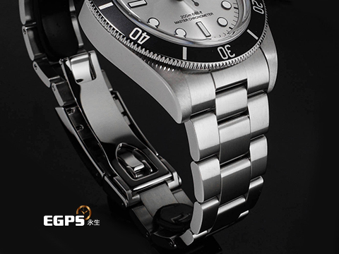 材質: 精鋼材質錶殼、旋入式錶冠、錶鍊帶及摺疊帶扣 / 銀白色面盤 / 黑色陽極氧化鋁單向旋轉字圈 / 夜光指針及時標 / 藍寶石水晶玻璃鏡面