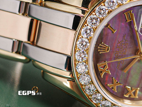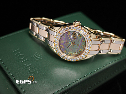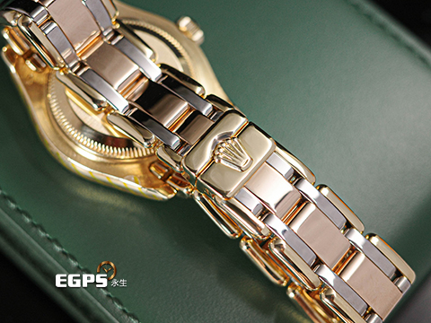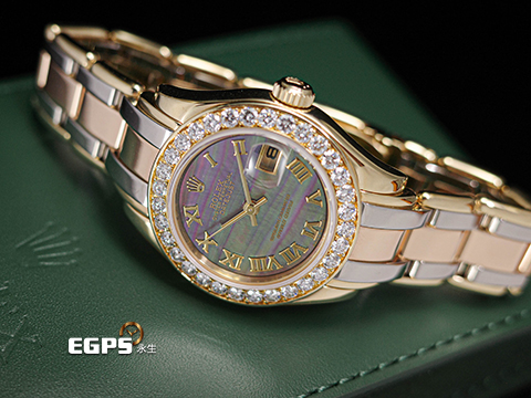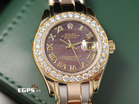 | ROLEX 勞力士 Lady-Datejust Pearlmaster 69298 蠔式 原廠鑲鑽 珍珠母貝面盤 18K黃金材質 經典三色金錶帶 彩虹帶 已回原廠原整保養,保固至2027年 自動上鏈 28mm |