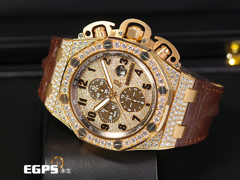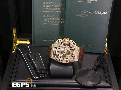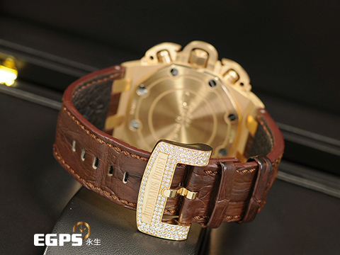 18k玫瑰金鑲鑽,原鑲276顆明亮型切割美鑽,總重約7.28克拉(錶殼、錶圈及扣環) / 原鑲滿天星搭配棕色計時器面盤、棕色螢光立體阿拉伯數字,玫瑰金螢光皇家橡樹指針、棕色內錶圈。332顆美鑽,總重約0.92克拉 / 原廠手工縫製凸背鰭棕色鱷魚皮 / 藍寶石水晶玻璃鏡面 / |