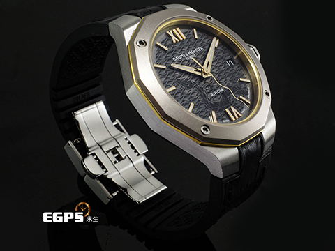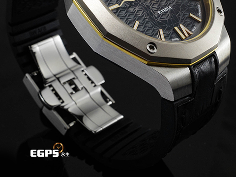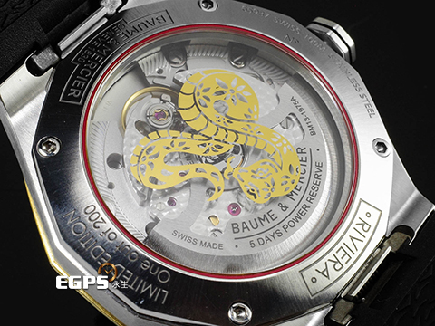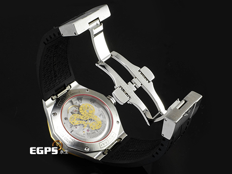 不鏽鋼材質錶殼、摺疊扣、旋入式錶冠 / 黑色蛇形圖案花紋面盤 / 金質夜光指針、時標 / 原廠黑色橡膠&皮革複合式材質錶帶 / 藍寶石水晶玻璃、透明錶背
