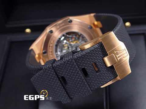 皇家橡樹獨特八角形螺絲外露設計黑色陶瓷材質錶圈 / 18K玫瑰金材質錶殼、標準穿扣、旋入式錶冠 / 黑色格紋面盤 / 夜光指針、立體柱狀時標 / 黑色橡膠錶帶 / 藍寶石水晶玻璃、透明錶背 / 22K金自動盤 |