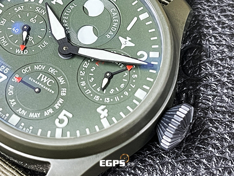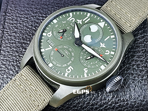 IWC 萬國 BIG PILOTS 大飛行員 萬年曆 七日鍊 月相盈虧 IW503101 綠色陶瓷材質 TOP GUN 海軍空戰部隊 「「森林地」特別版 綠色面盤 經典南北月相萬年曆腕錶、四位數字年份顯示 2024年保單 專賣店限定款 新錶參考訂價:1,716,000元 搭配沙夫豪森IWC萬國錶首款陶瓷錶鏈 自動上鍊 46.5mm