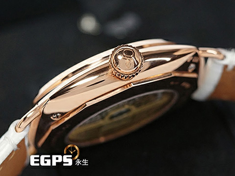 材質: 18K玫瑰金材質錶殼及折疊帶扣 / 黑色經典面盤 / 原鑲鑽時標 鑲嵌88顆明亮式切割鑽石 共0.22CT / 旋入式錶冠 / 全新客製化白色皮革錶帶 / 藍寶石水晶玻璃鏡面及透明錶背