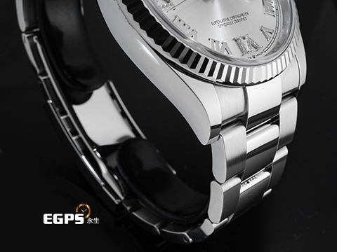 904L不鏽鋼材質錶殼、錶鍊帶、摺疊扣、旋入式錶冠 / 原廠鑲嵌鑽石VI IX時標 銀灰色太陽紋放射面盤 / 18K白金材質錶外框 / 藍寶石水晶玻璃鏡面 |