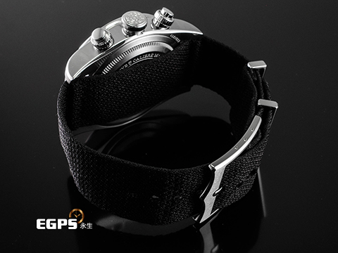 不鏽鋼錶殼、穿扣、旋入式錶冠 / 黑色織紋錶帶 / 黑色熊貓面盤 / 夜光雪花指針及時標 / 藍寶石水晶玻璃 |