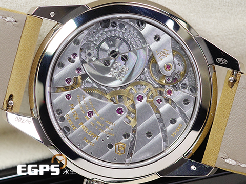 18K白金錶殼、原廠白金摺疊錶扣 / 炭灰色漆面紋理錶盤 / 鉑金偏心微型自動盤 / 全新米色絨面小牛皮錶帶 / 藍寶石水晶玻璃、透明錶背 |