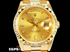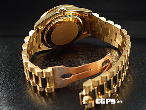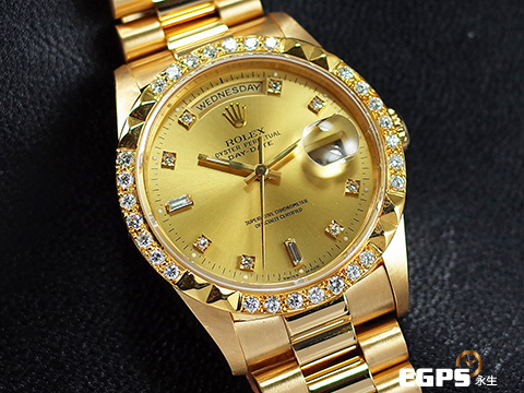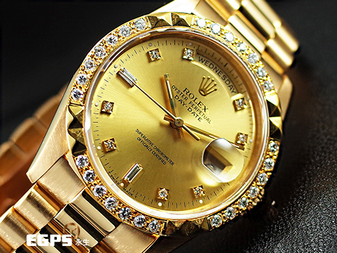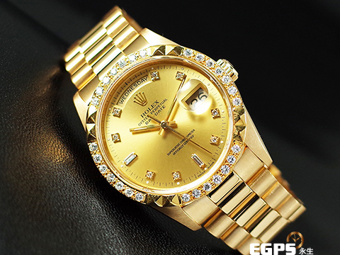 ROLEX 勞力士 DAY-DATE 蠔式星期日誌型 DD 36 18238 18K黃金材質 原廠鑲嵌鑽石時標 金色面盤 精鑲金字塔鑽圈 自動上鍊 36mm |