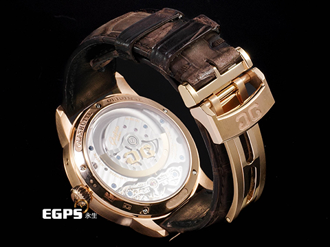 18K玫瑰金材質錶殼、摺疊帶扣 / 偏心設計銀白色面盤 / 18K玫瑰金材質指針、時標 經典藍鋼小秒針 / 抗磨損藍寶石水晶玻璃 / 棕色鱷魚皮革錶帶 / 透明錶背蓋 / 21K金自動盤 |