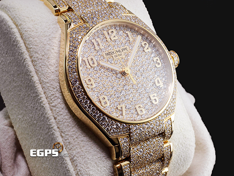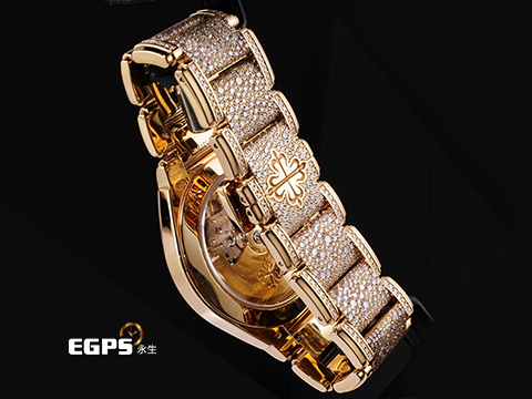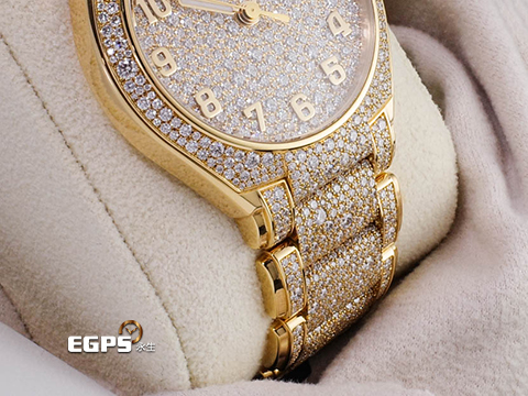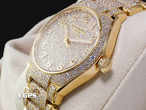 18K玫瑰金材質錶殼、錶鍊帶及按動式折疊帶扣 / 原廠鑲嵌384顆鑽石滿天星面盤(共2.51克拉)、351顆鑽石錶殼(共1.94克拉)、13顆鑽石錶冠(共0.06克拉)、2,490顆鑽石錶帶(共12.7克拉)/ 藍寶石水晶玻璃鏡面及透明錶背 / PP印記 |