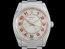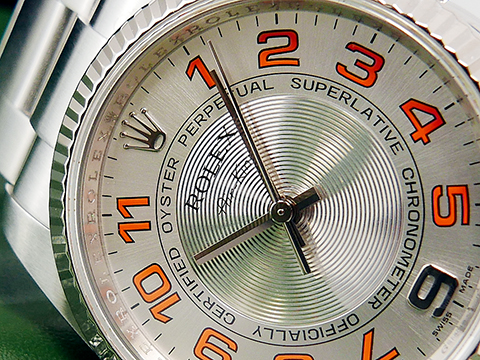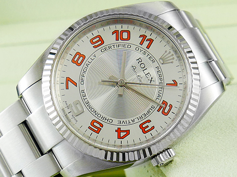 | ROLEX 勞力士 Air-King 114234 蠔式恆動 空中霸王 橘色阿拉伯數字時標 同心圓雕紋銀色面盤 自動上鏈 34mm |