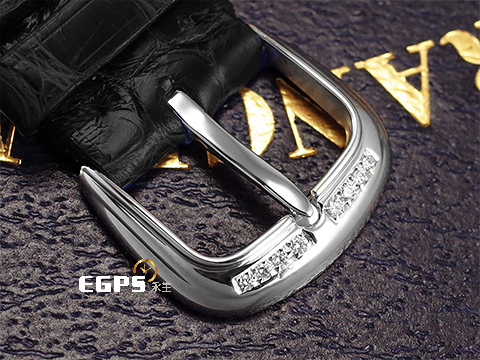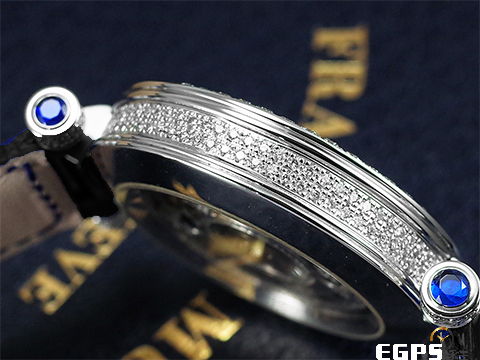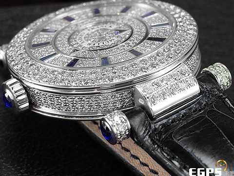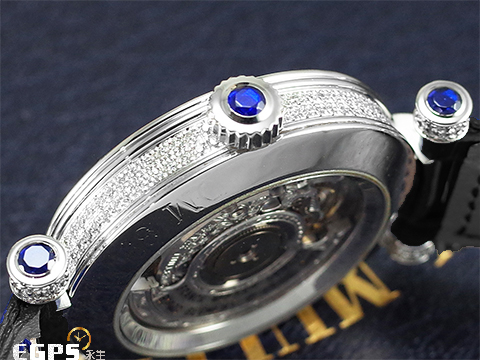 18K白金材質錶殼及原廠鑲嵌鑽石傳統穿帶扣 / 原廠鑲嵌滿天星鑽石面盤、錶殼及錶耳 / 原廠鑲嵌藍色寶石時標 / 客製化黑色鱷魚皮錶帶 / 藍寶石水晶玻璃鏡面及透明錶背 |