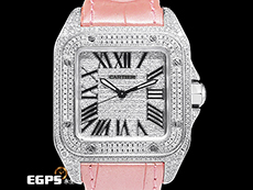 | CARTIER 卡地亞 Santos 100 山度士 中型 精鑲滿天星鑽石面盤、鑲鑽錶圈 粉色客製化皮革錶帶 自動上鍊 36mm |