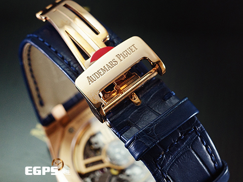 皇家橡樹獨特八角形螺絲外露設計錶框 / 18K玫瑰金錶殼、摺疊扣、旋入式錶冠、計時按把 / 大型格紋深藍色熊貓面盤 、夜光指針、柱狀時標 / 原廠藍色鱷魚皮革錶帶 藍寶石水晶玻璃 |