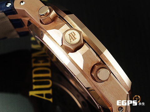 | Audemars Piguet 愛彼 AP錶 Royal Oak Chronograph 皇家橡樹 26239OR.OO.D315CR.01 藍金熊貓格紋面盤 飛返 計時碼表 26239OR 玫瑰金材質 新款4401機芯 透明底蓋 2021年保卡 自動上鏈 41mm |