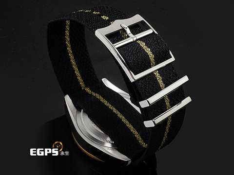 材質: 不鏽鋼材質錶殼、黃金旋入式錶冠 / 黃金雙向旋轉外圈 配啞棕色及黑色陽極氧化鋁字圈 / 黑色面盤、雪花形夜光指針、時標 / 原廠黑色帆布錶帶 / 藍寶石水晶玻璃