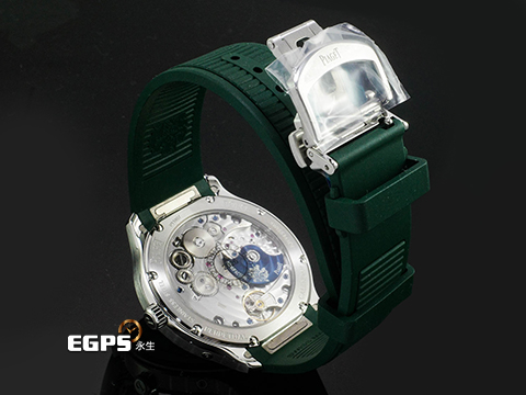 不鏽鋼材質錶殼、錶帶、按動式摺疊帶扣及錶冠 / 圓模雕刻紋理深祖母綠色錶盤 / 藍寶石水晶玻璃鏡面及透明錶背 / 微型自動盤鐫刻有伯爵品牌印記 |