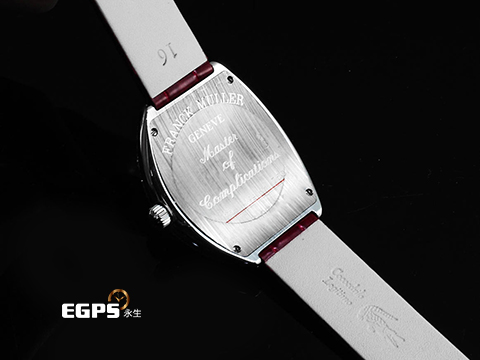 材質: 18K白金材質酒桶型錶殼、錶底蓋及傳統穿扣 / 銀白色放射雕紋面盤 / 紅色羅馬數字時標及4點鐘心型鑲鑽時標 / 原廠鑲嵌天然美鑽於錶圈、帶扣及面盤時標 / 全新客製化深紅色皮錶帶 / 藍寶石水晶玻璃鏡面