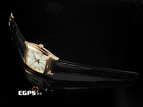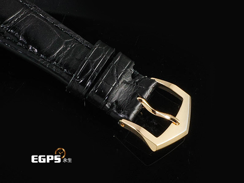 材質: 18K玫瑰金材質酒桶型錶殼、穿扣 / 銀白色面盤 / 18K玫瑰金立體時標及指針 / 全新客製化黑色皮錶帶 / 藍寶石水晶玻璃鏡面及透明錶背 / 22K自動盤