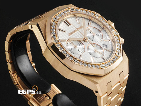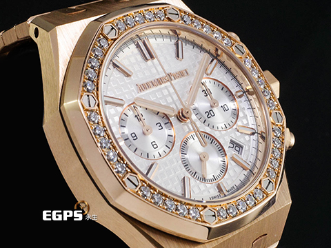 材質: 皇家橡樹獨特八角形螺絲外露設計錶圈、原廠鑲鑽錶圈(40顆明亮型切割美鑽 0.92克拉) / 玫瑰金材質錶殼、錶鍊帶及摺疊扣 / 白色Grande Tapisserie錶盤 / 夜光指針、夜光時標 / 藍寶石水晶玻璃鏡面