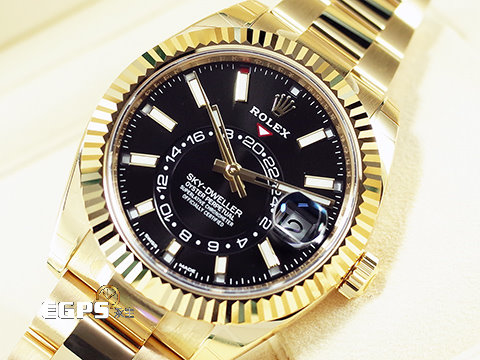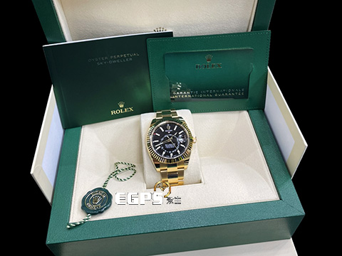 ROLEX 勞力士 Sky-Dweller 天行者 326938 18K黃金材質 沙羅系統 年曆錶 兩地時區 柱狀時標黑色面盤 2023年保卡 自動上鍊 42mm